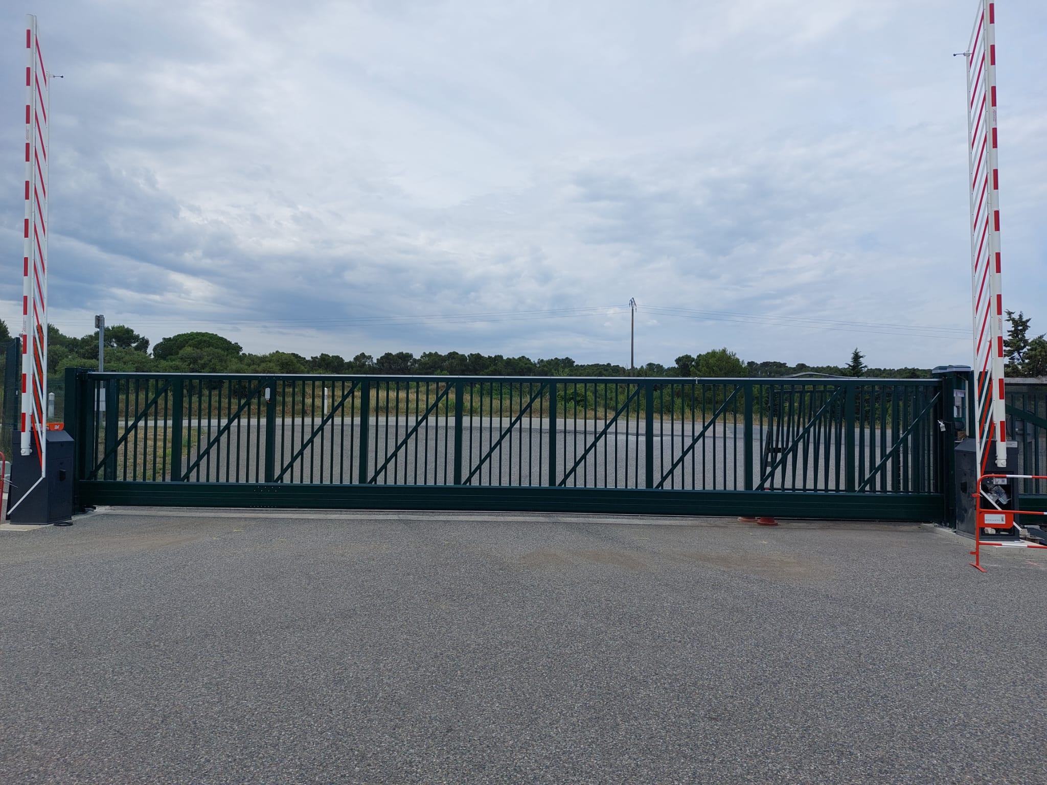 Afin de contrôler le flux des camions, le portail a été couplé avec l’installation de 2 barrières automatiques. Tout le matériel a été équipé de récepteurs identiques pour le poste de garde puisse gérer avec une seule télécommande la gestion du portail et des barrières. Ils fonctionnement avec un asservissement, c’est-à-dire que si le portail n’est pas ouvert à 100 % les barrières ne peuvent pas fonctionner, cela afin d’éviter aux poids lourds d’accrocher le portail pendant la manœuvre.