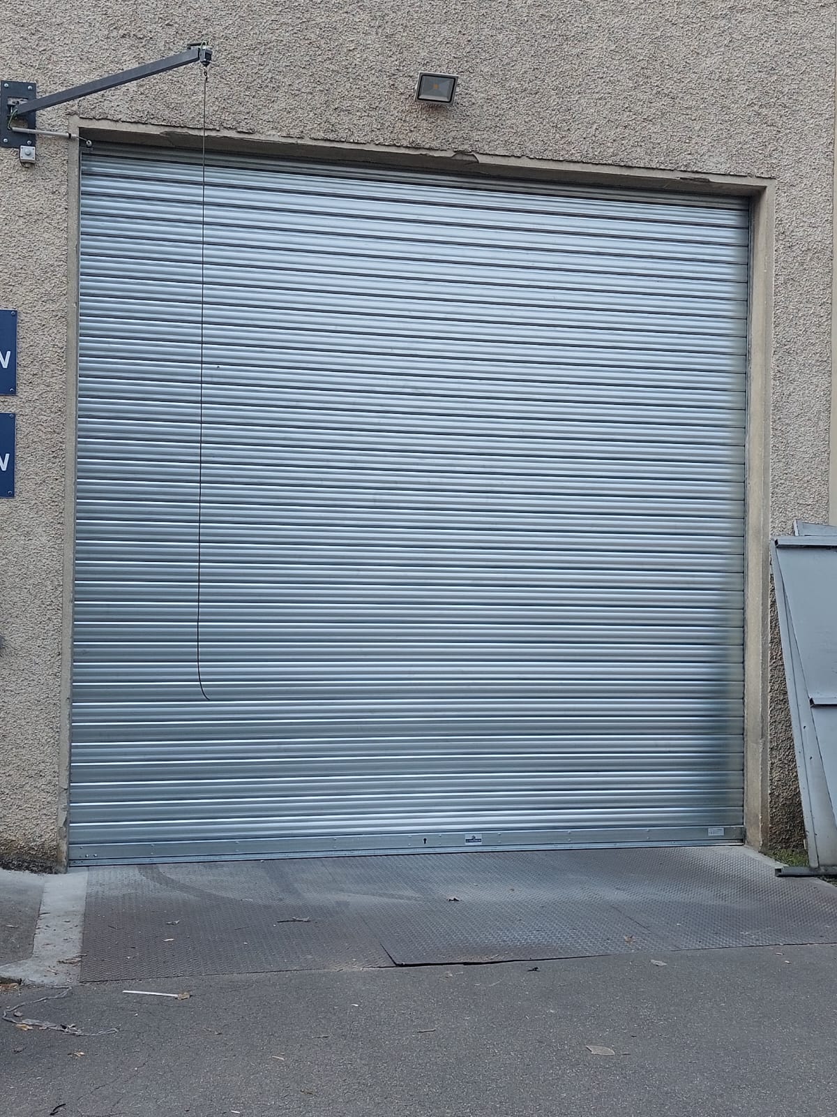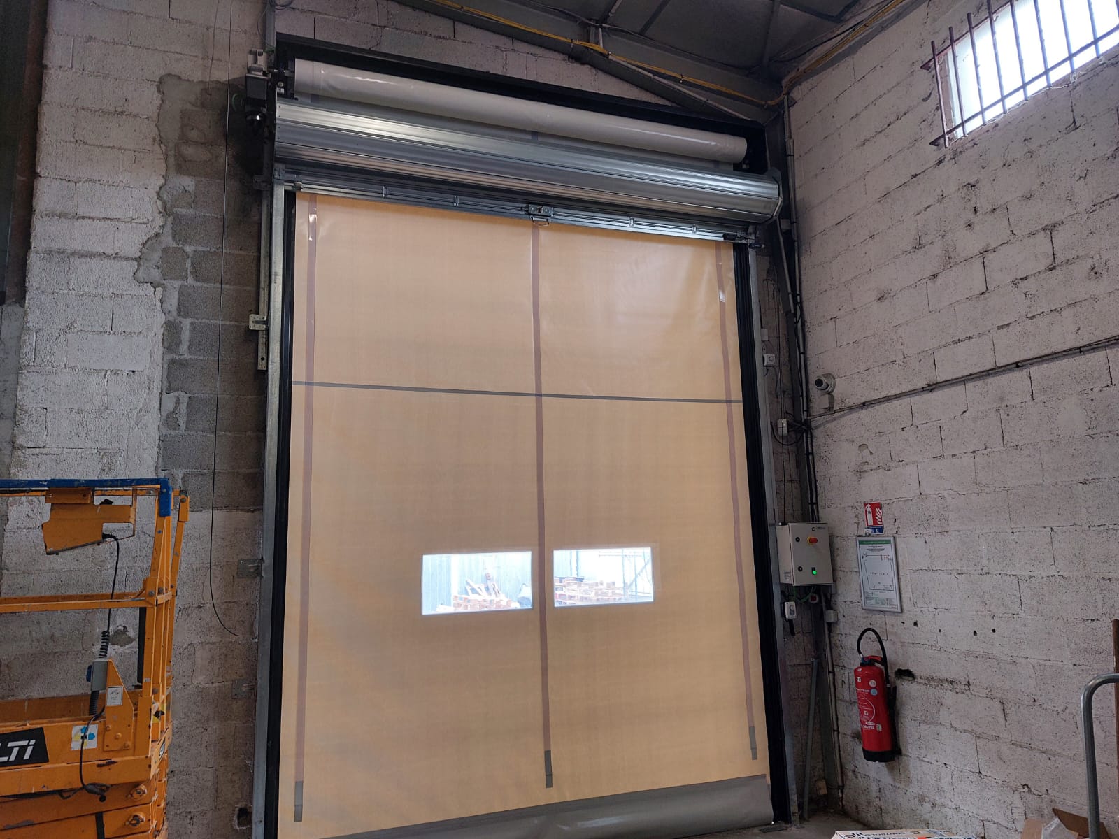 Le client était équipé de portes métalliques coulissantes vétustes, nous les avons remplacé par des systèmes bi-portes composés d’un rideau métallique avec une porte souple automatique.